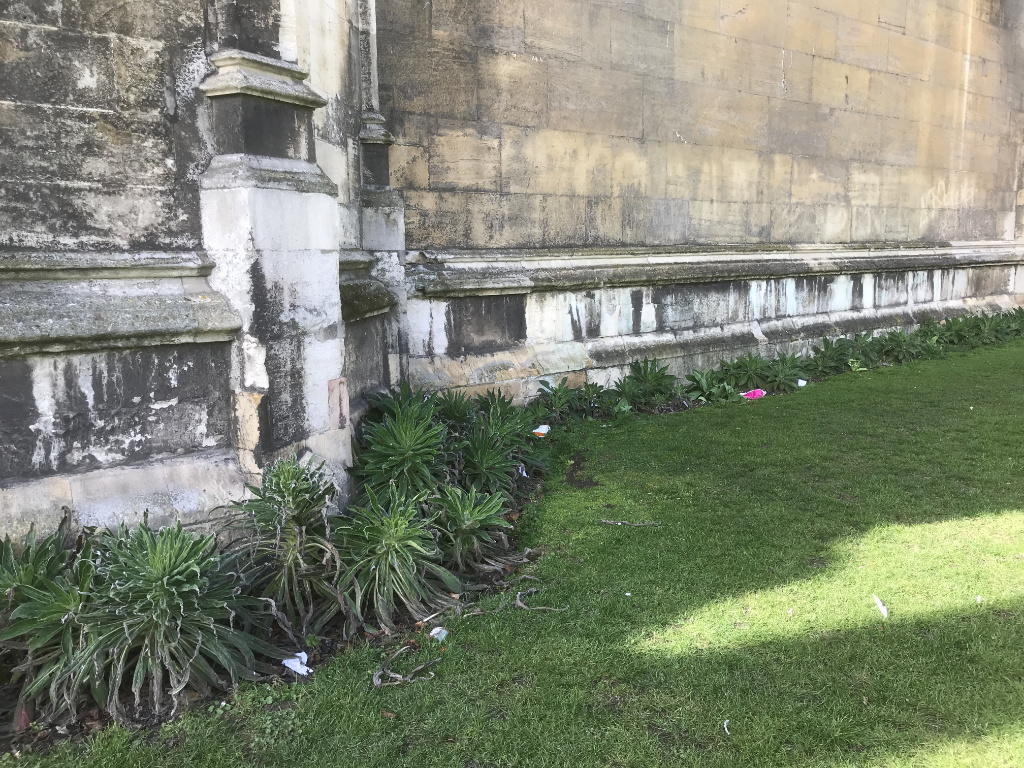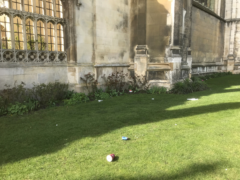 Before Covid, I would regularly purchase a coffee from Benet's Cafe, then sit outside and take in the views of the majestic King's College before taking a morning stroll along the backs. On this occassion, due to the restriction of pandemic, I enjoyed my takeaway coffee socially distanced sitting on the King's College wall. However, my view was marred by the amount of litter scattered across the grass and at the foot of chapel. Why can't people use the numerous bins?